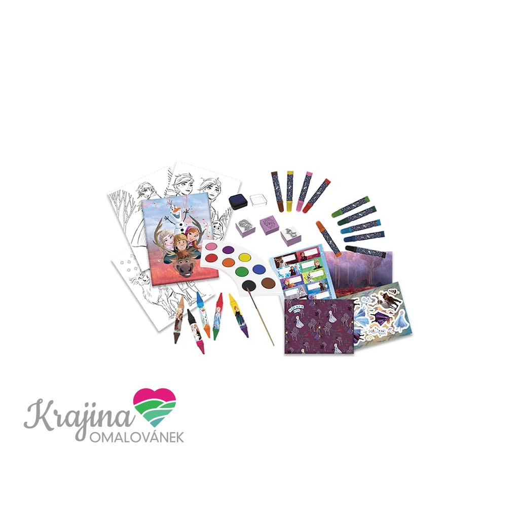 Set obsahuje bohatou škálu kreativních nástrojů, včetně samolepek, pastelek a dalších výtvarných doplňků, díky kterým si děti mohou vytvořit své vlastní pohádkové dílo inspirované Elsou, Annou a jejich přáteli.