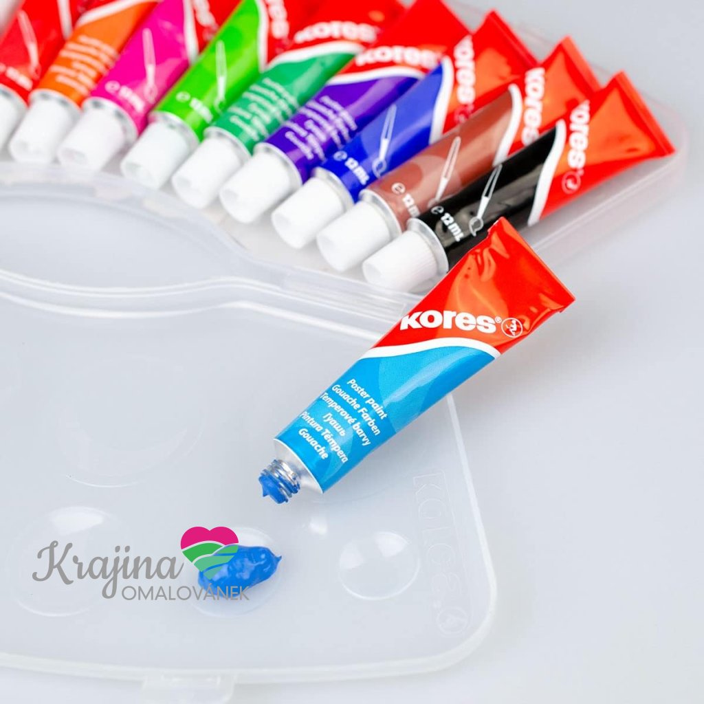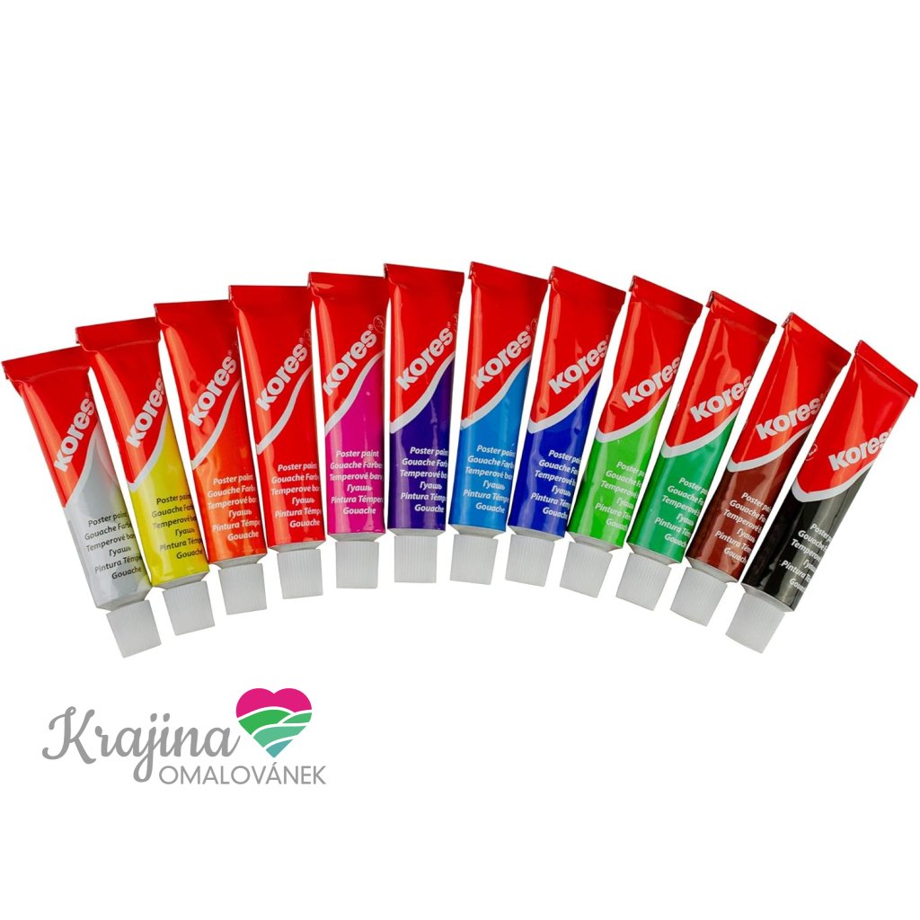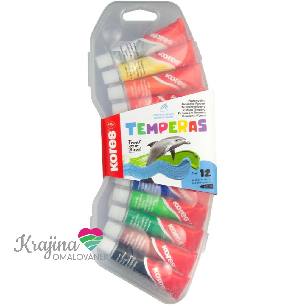 Tempery Kores jsou dodávány v praktickém sadě po 12 tubách o objemu 12 ml, což je ideální pro školní i domácí výtvarné aktivity.