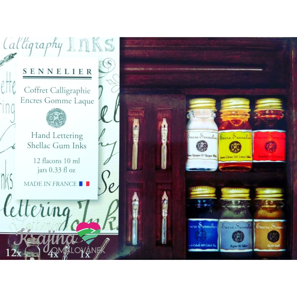 Sada Sennelier obsahuje 12 kaligrafických inkoustů o objemu 10 ml.