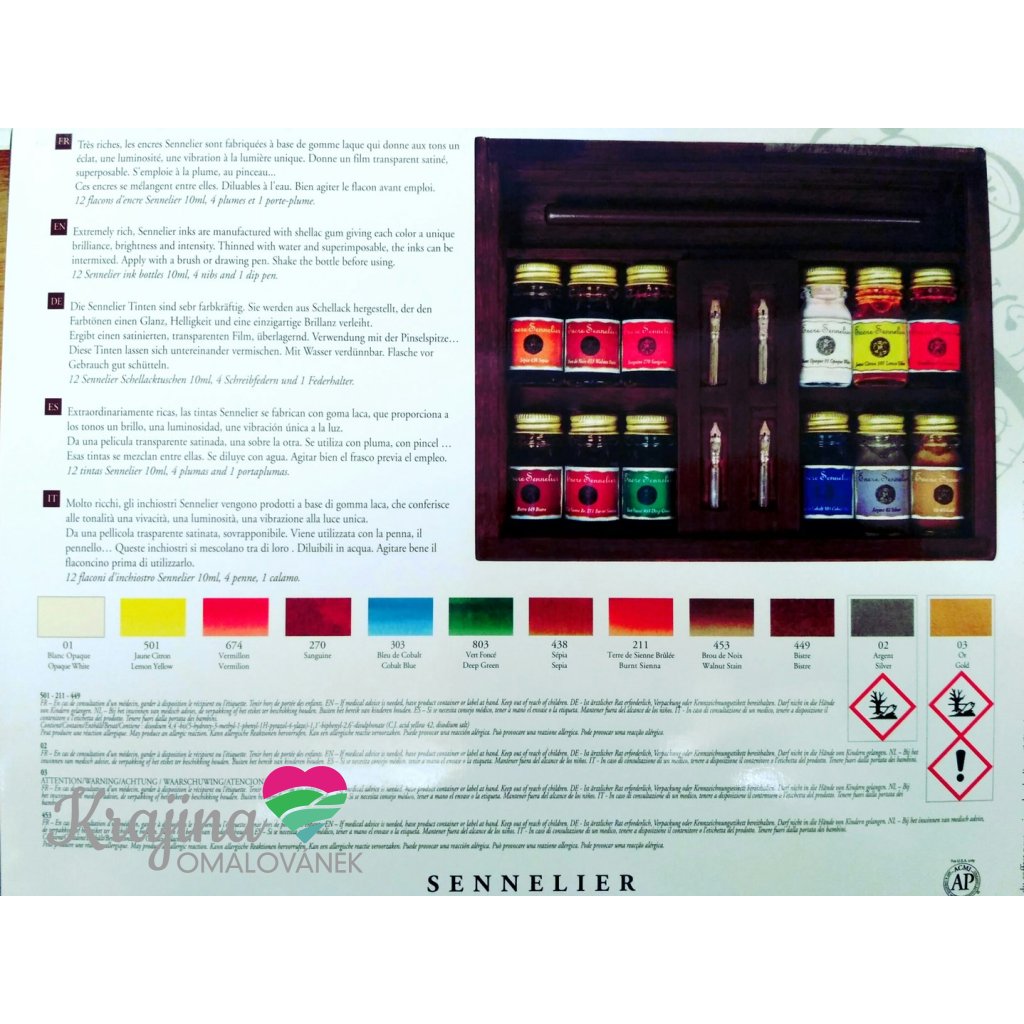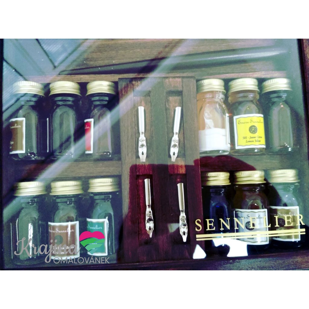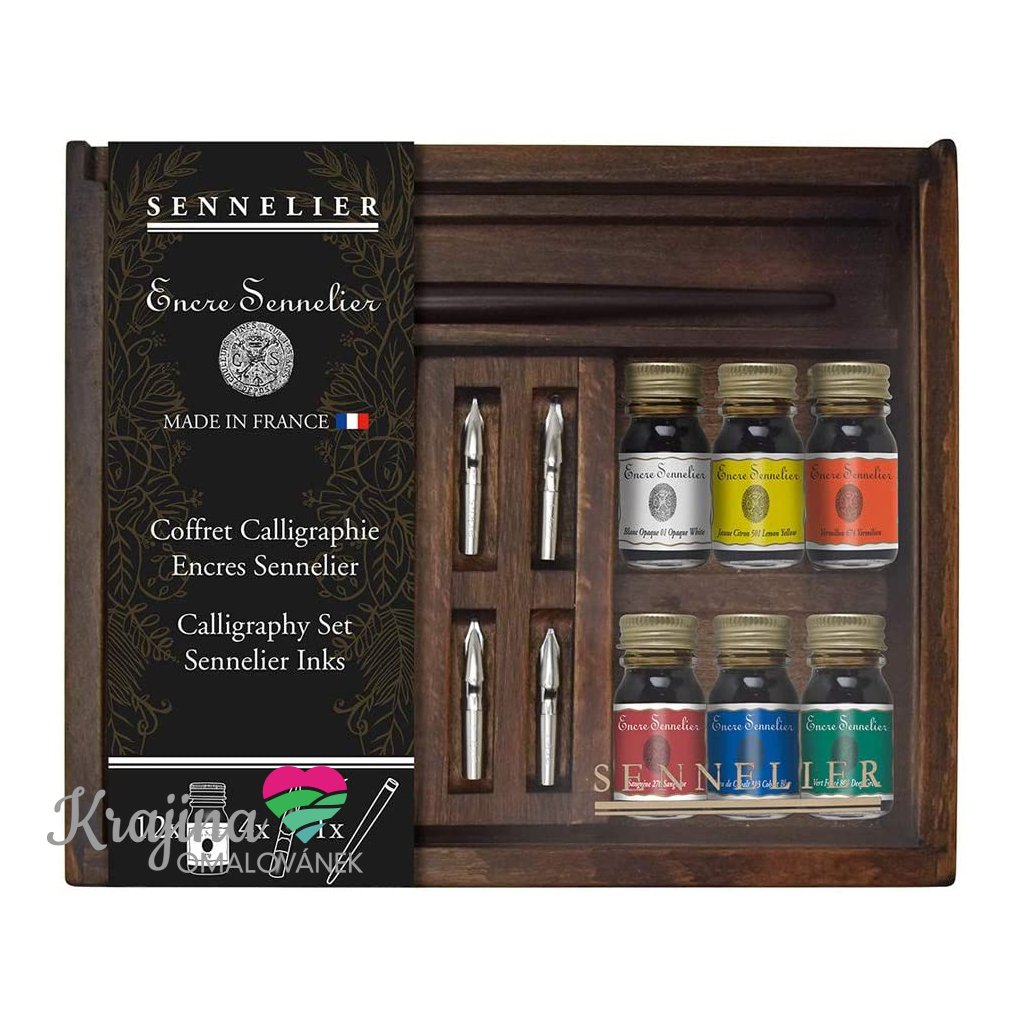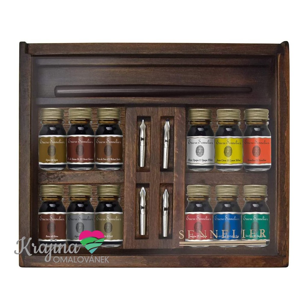 Sennelier, 134025, Calligraphy wood ink set, kaligrafická sada, 12 ks inkoustů a příslušenství