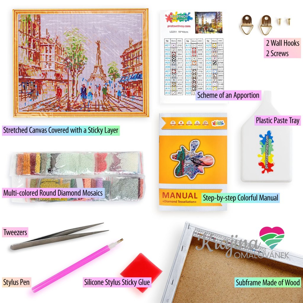 Vybírat můžete z různých motivů a také různých velikostí pláten. Po vyskládání mozaiky je možné obraz ihned pověsit na zeď, není třeba plátno natahovat či jinak upravovat.